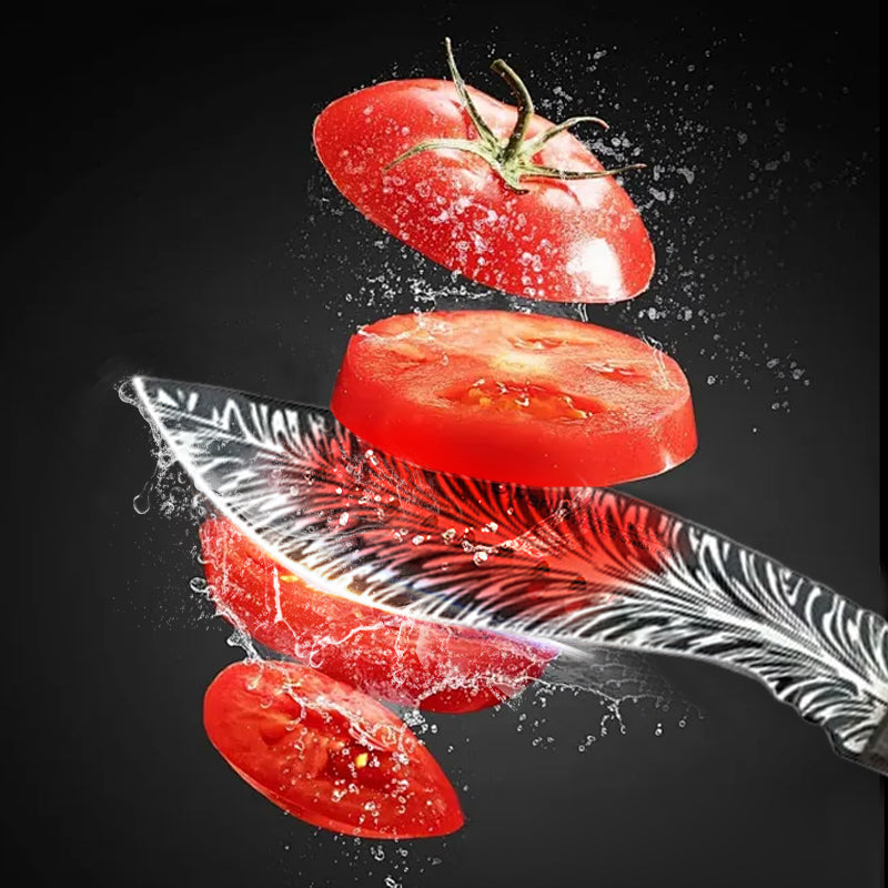 UNIQUE FEATHER PATTERN DESIGN - The blades are engraved with a stunning feather pattern that enhances the aesthetics while maintaining a professional look, perfect for grilling presentations and kitchen displays.