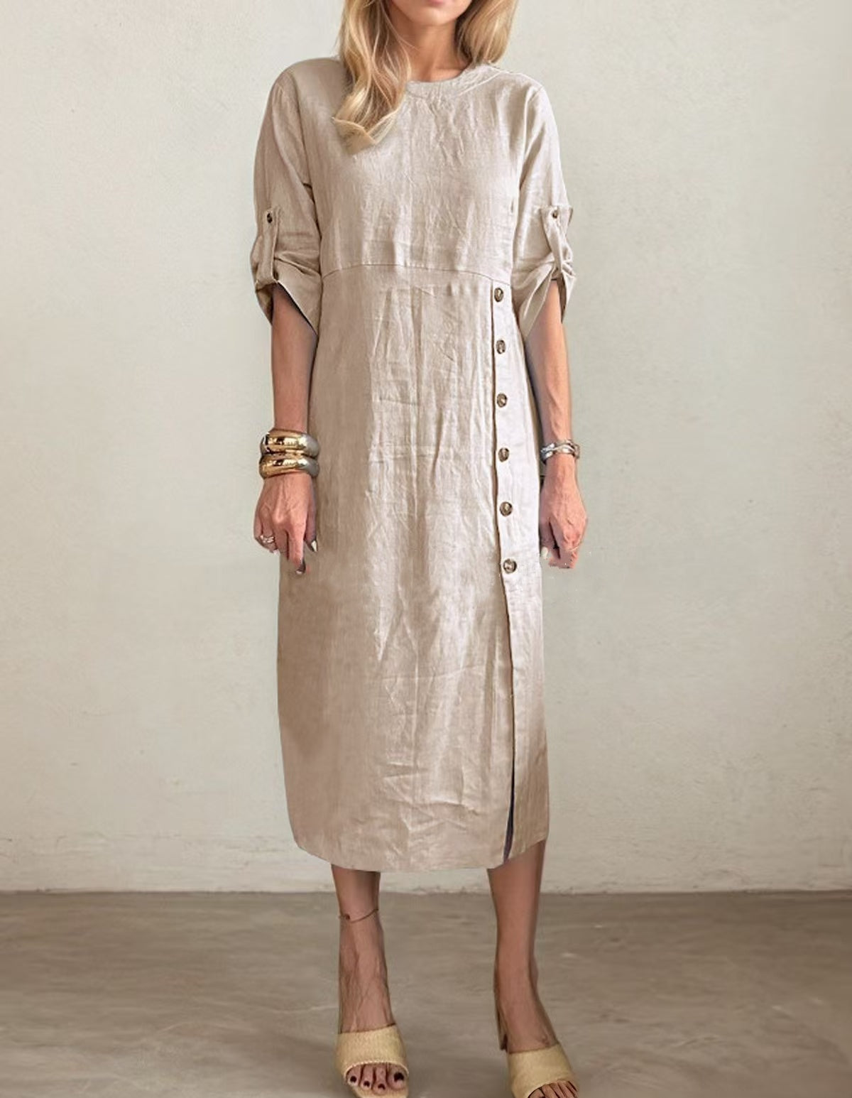 Nothing compares to the lightness and elegance of a cotton linen dress. This Button-Down Side Slit Maxi Dress is the perfect piece for women who value a refined and comfortable style at the same time.