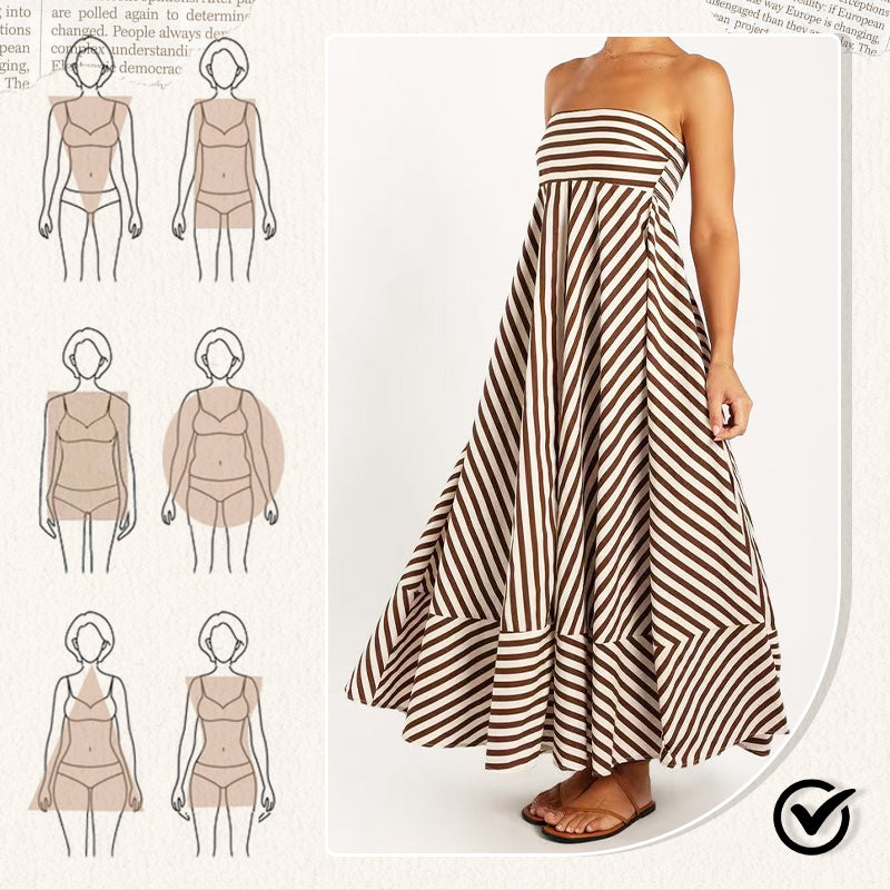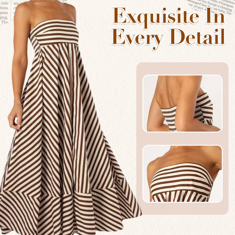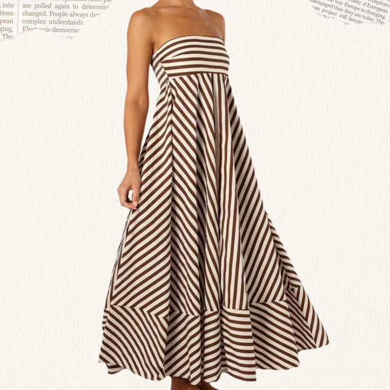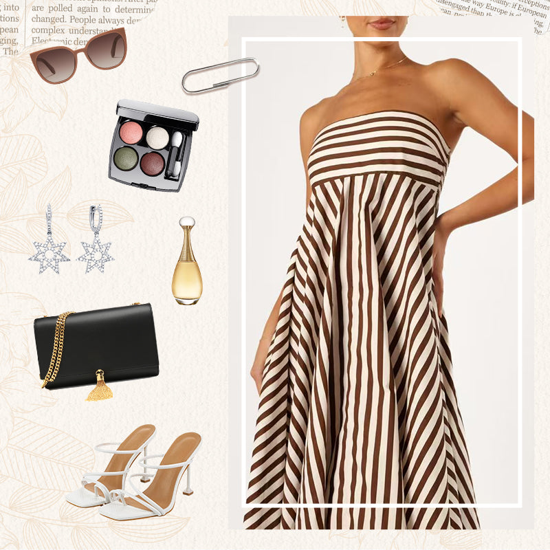 STRIPED PRINT – Featuring a white and brown stripe print, the dress brings a fresh take on visual texture. The stripes elongate the figure and add subtle detail without overpowering the overall design. It's a refined way to introduce pattern into your wardrobe, ideal for warm-weather settings.